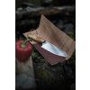 Rukojeť inspirovaná tvarem klasických outdoorových nožů Helle nabízí ergonomický a bezpečný úchop. Plochý bolster umožňuje pevné držení při krájení zeleniny, zatímco širší část rukojeti podporuje pohodlné plátkování i Vaření náročnějších surovin. Materiálem je kudrnatá bříza (curly birch) s přírodní antibakteriální ochranou a individuálním vzorem – každý nůž je tedy unikát.