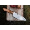 Čepel z leštěné oceli Alleima 12C27 (pevnost 59–61 HRC) poskytuje špičkovou ostrost a snadné krájení veškerých surovin, zároveň ale zvládne i sekaní díky dostatečné tloušťce hřbetu. Tvar čepele je kombinací tradičního evropského chef nože a japonského Santoku – vyvážený detail pro menší i větší řezání. Nůž má ploché broušení (full flat grind).