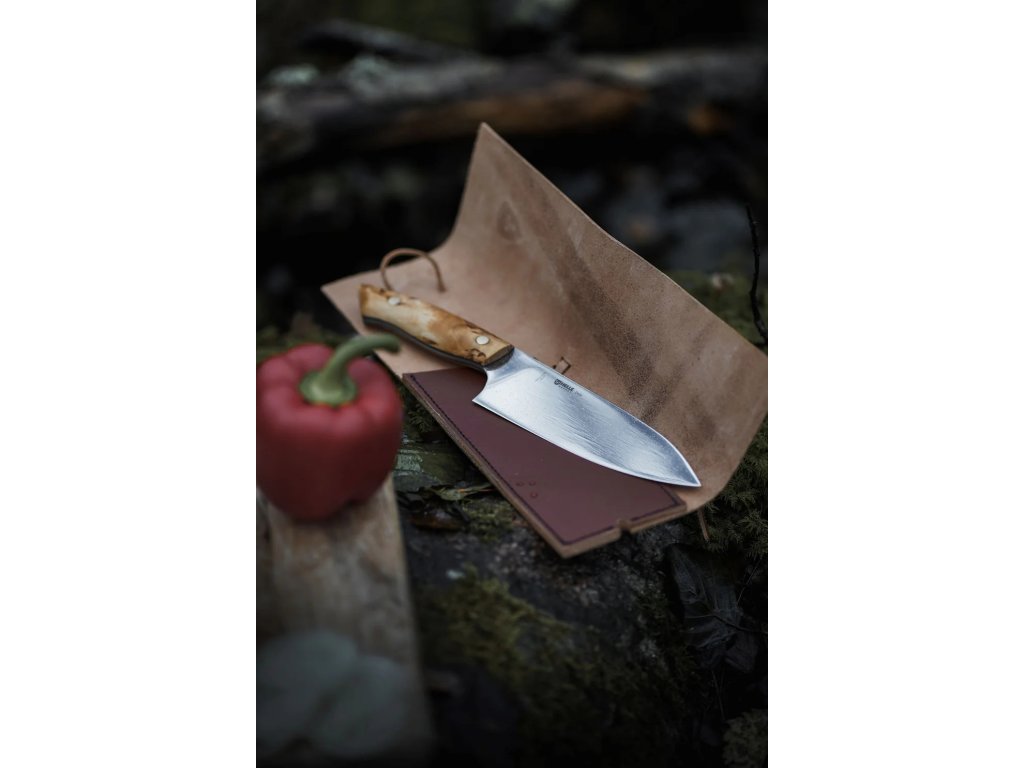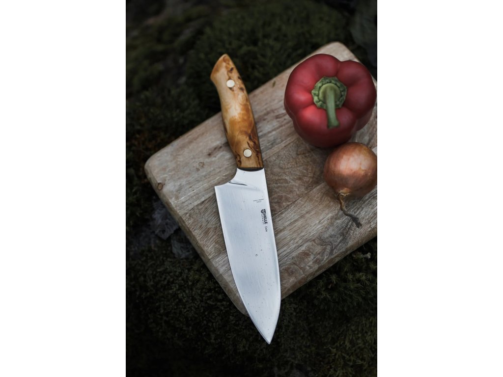 Rukojeť inspirovaná tvarem klasických outdoorových nožů Helle nabízí ergonomický a bezpečný úchop. Plochý bolster umožňuje pevné držení při krájení zeleniny, zatímco širší část rukojeti podporuje pohodlné plátkování i Vaření náročnějších surovin. Materiálem je kudrnatá bříza (curly birch) s přírodní antibakteriální ochranou a individuálním vzorem – každý nůž je tedy unikát.