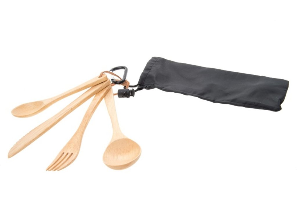 Vidlička, nůž, lžíce, lžička a úložný sáček.