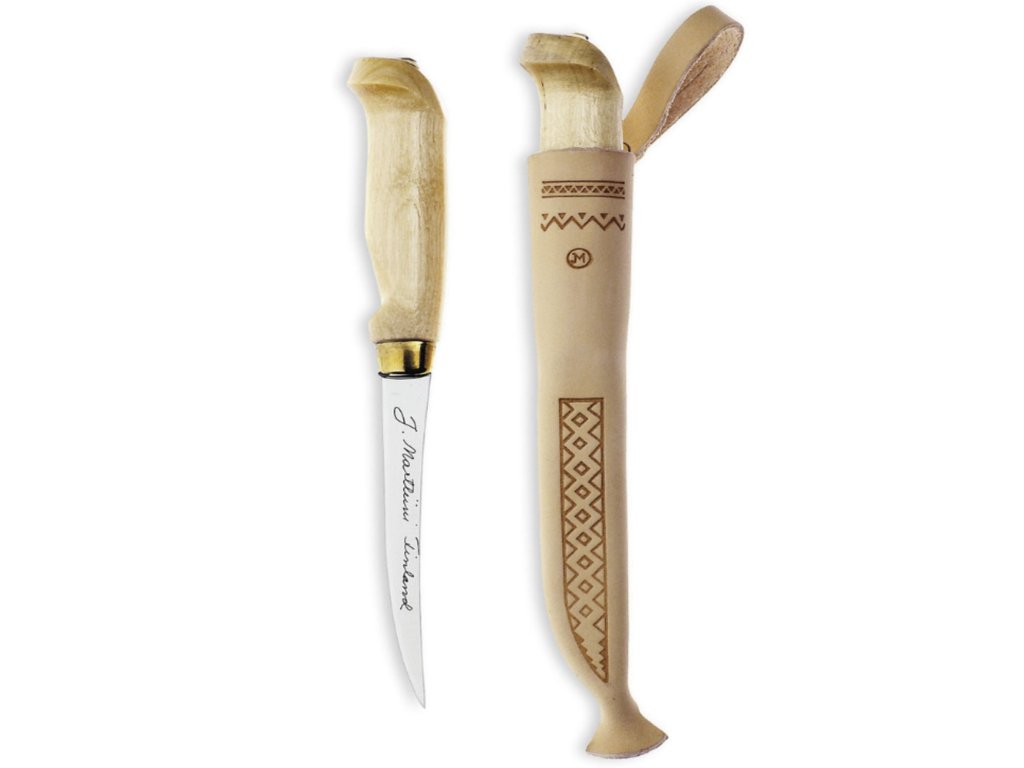 Malý filetovací nůž Marttiini finské výroby s březovou rukojetí a zdobenou koženou pochvou.