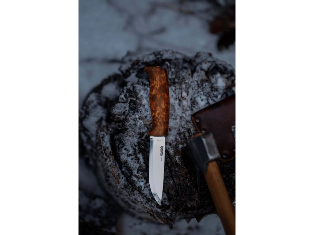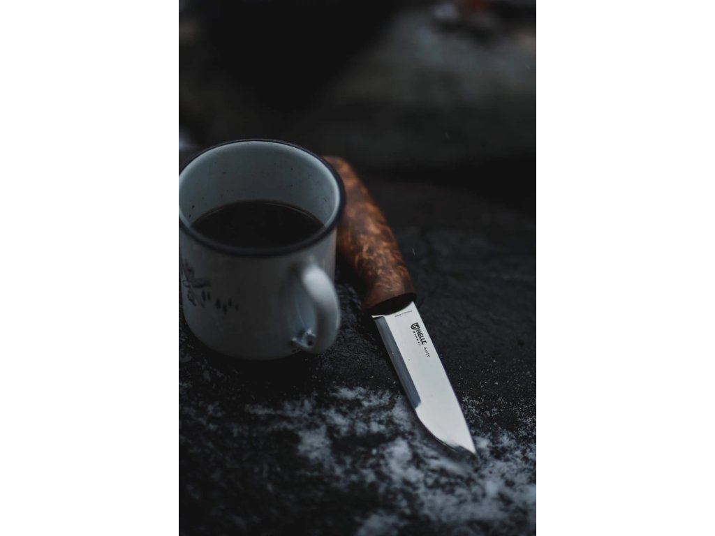 Čepel je vyrobena z nerezové oceli Sandvik 12C27 – odolné vůči korozi, snadno se udržuje a skvěle drží ostří. Rukojeť z masivního kadeřavého břízového dřeva je ergonomicky tvarovaná a dobře padne do ruky. Každý kus je jedinečný díky přírodní kresbě dřeva.
