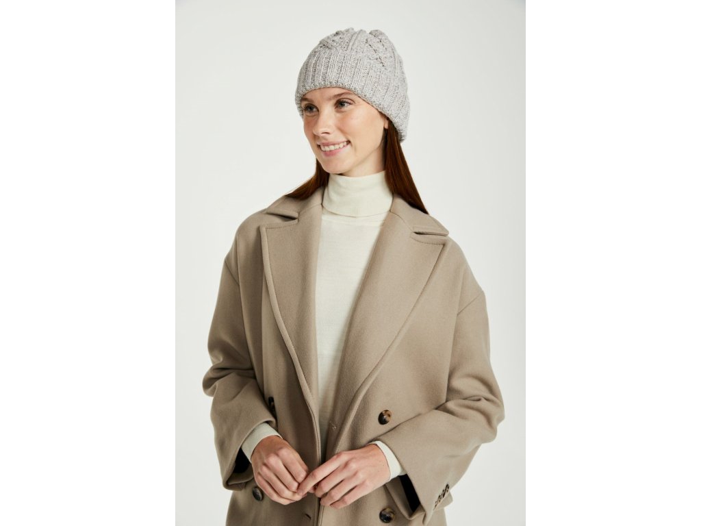 Diamantový úplet doplňuje svislé žebrování a ohrnutý lem, který zpevní oblast uší. Materiál drží teplo a je příjemný na dotek. Vhodné pro milovníky jednoduchých přírodních materiálů a irského řemesla.