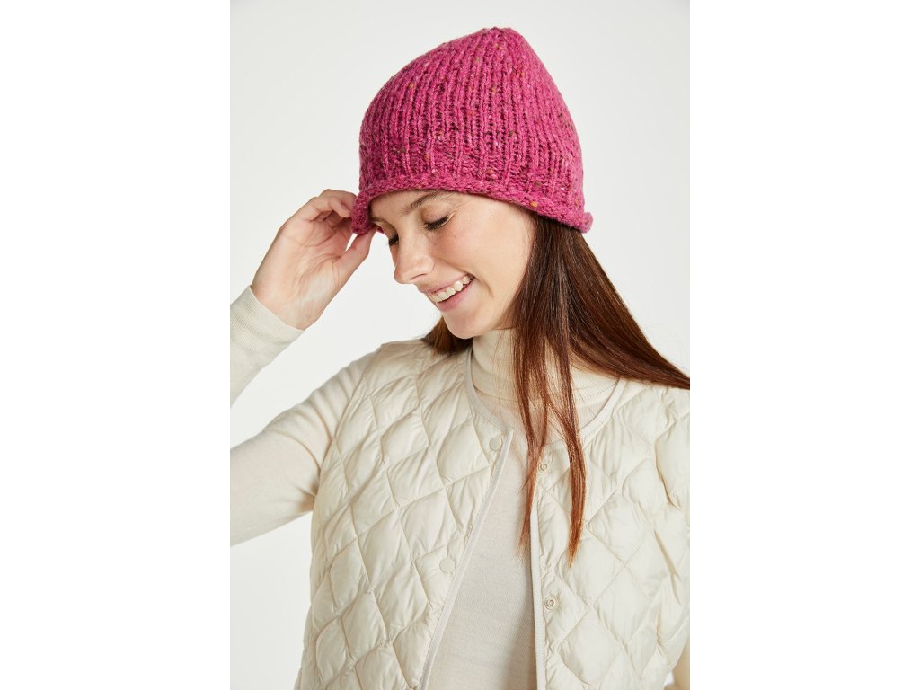 Pletená zimní čepice je vyrobená ze 100 % čisté vlny. Barevné neppy v úpletu vytvářejí jemný tweedový vzhled, který působí přirozeně a snadno se kombinuje s běžným oblečením. Rolovaný lem a jednoduchý střih dodávají čepici nenápadný charakter a praktické využití.