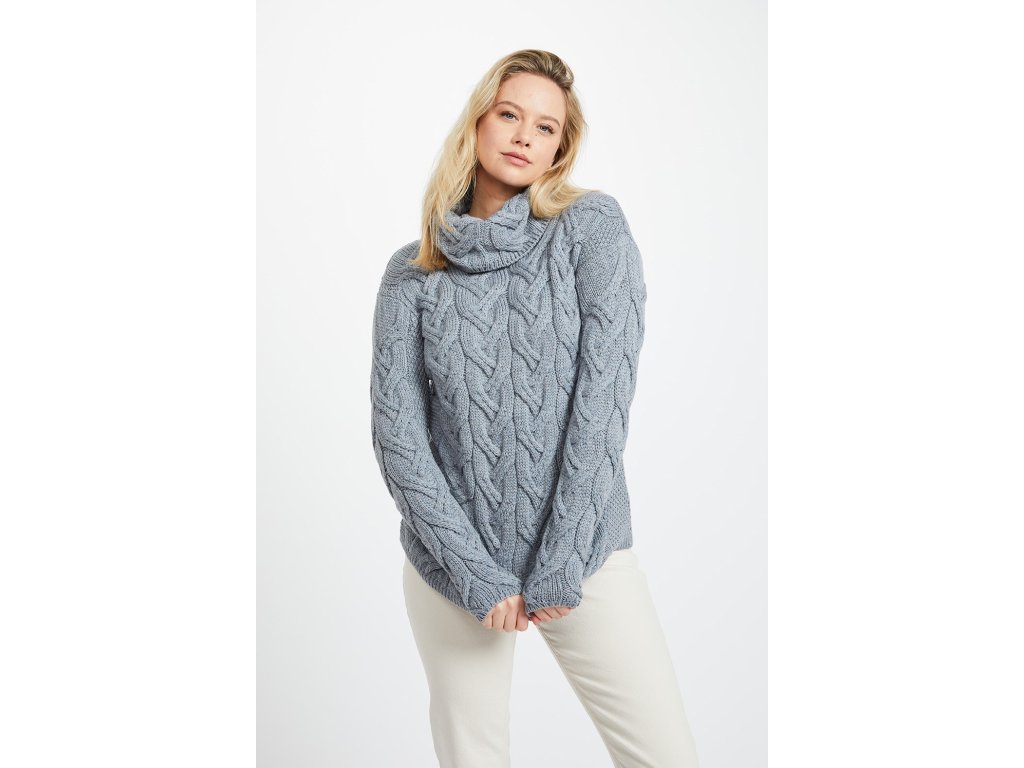 Tento svetr s výrazným copovým vzorem navazuje na aran tradici, ale podává ji v současné podobě. Hlavním prvkem je široký cowl límec, který se volně rozkládá přes ramena a dodává celému střihu klidný, měkký tvar. Celoplošný dvouprstý kabel vytváří silnou strukturu, která je viditelná na první pohled.