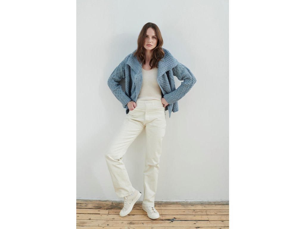 Tento svetr navazuje na tradiční aranové vzory, ale pracuje s nimi volněji a skládá je do výrazné patchworkové struktury. Velký límec působí jako další vrstva a dá se nosit spuštěný i vytažený k krku. Jediný dřevěný knoflík drží přední díl čistě a nechává vyniknout samotný úplet.