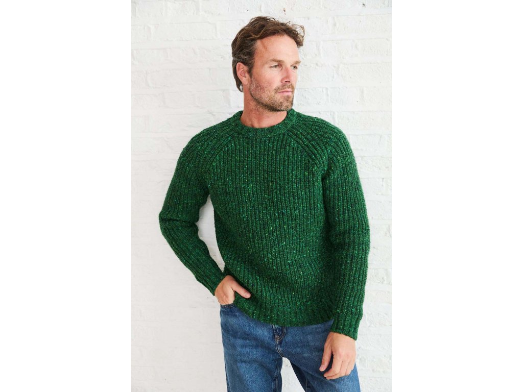 Pánský svetr z pravé donegalské vlny je upletený v klasickém rybářském žebrování, které mu dodává výraznou strukturu a pružnost. Díky typické neppované přízi má svetr jemný „tweedový“ vzhled s barevnými nopky, které podtrhují přirozený charakter irské vlny.