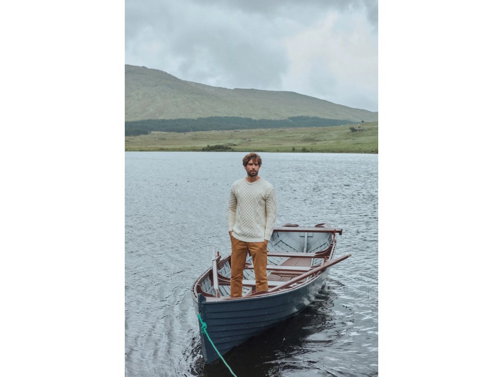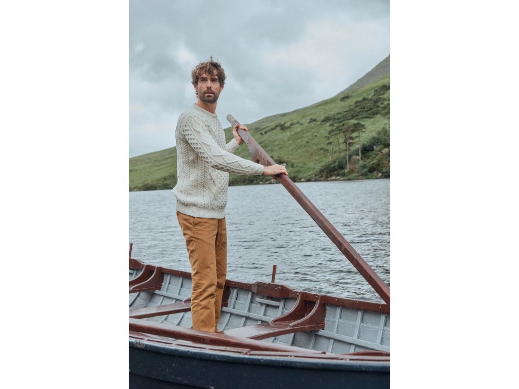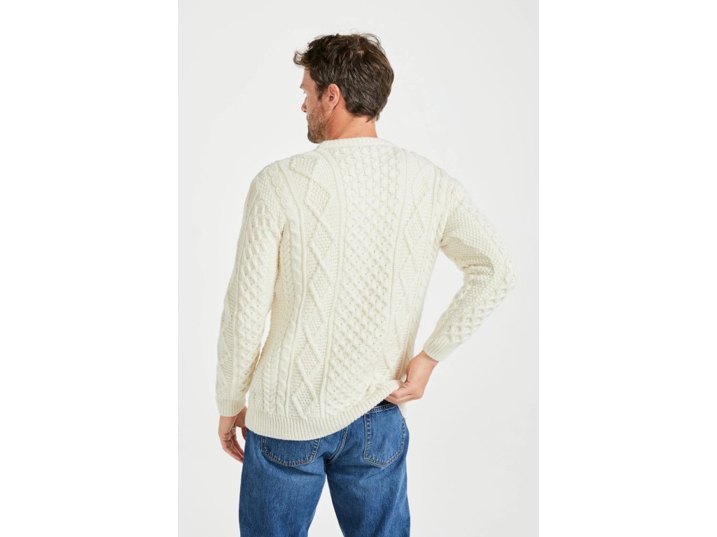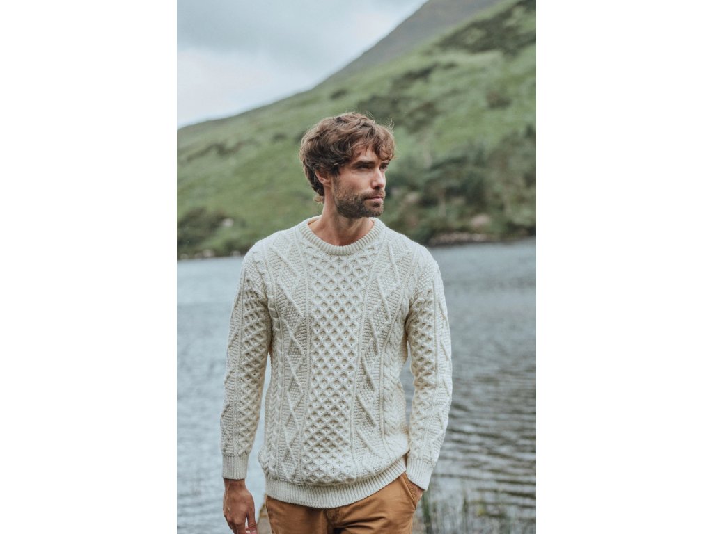 Prémiový irský svetr z měkké merino vlny, inspirovaný tradičními aran vzory.