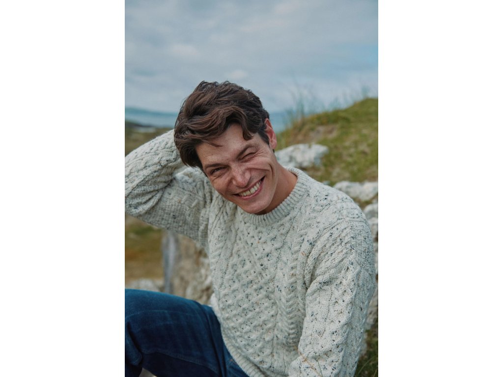 Tento krásný pánský Aranský svetr v barvě smetany s barevnými nopky (malé barevné tečky ve vlně) je pojmenován po nejmenším z Aranských ostrovů – Inisheer.