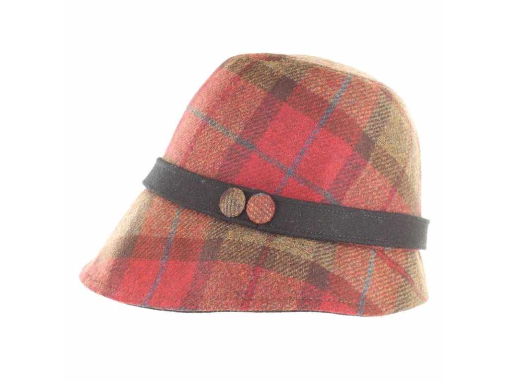 Tkanina má pevnou vlněnou strukturu, která drží barvy i vzor. Klobouk doplňuje pás s dvojicí potažených knoflíků, což celé siluetě dodává klidný a čistý vzhled.