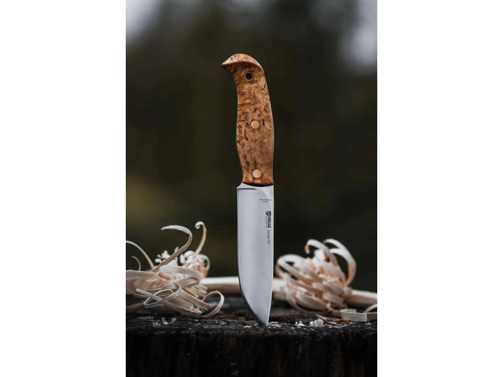 Ploché ostří je 2,1 mm silné a čepel je z velmi odolné, nerezové oceli 12C27 Alleima. Celková hmotnost nože je pouhých 100 g, což je extrémně málo pro fulltang nůž této velikosti.