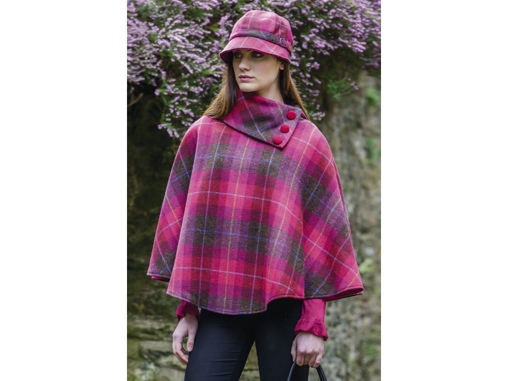 Woolen tkanina má pevnou strukturu a jemný povrch. Typický je široký límec s knoflíky a volný střih, který dopadne přirozeně kolem těla. Vzor i střih vycházejí z irského venkova a propojují řemeslo a jednoduchý, funkční tvar. Saténová podšívka zvyšuje pohodlí při nošení a umožňuje, aby pončo dobře sedělo na jakékoli postavě.