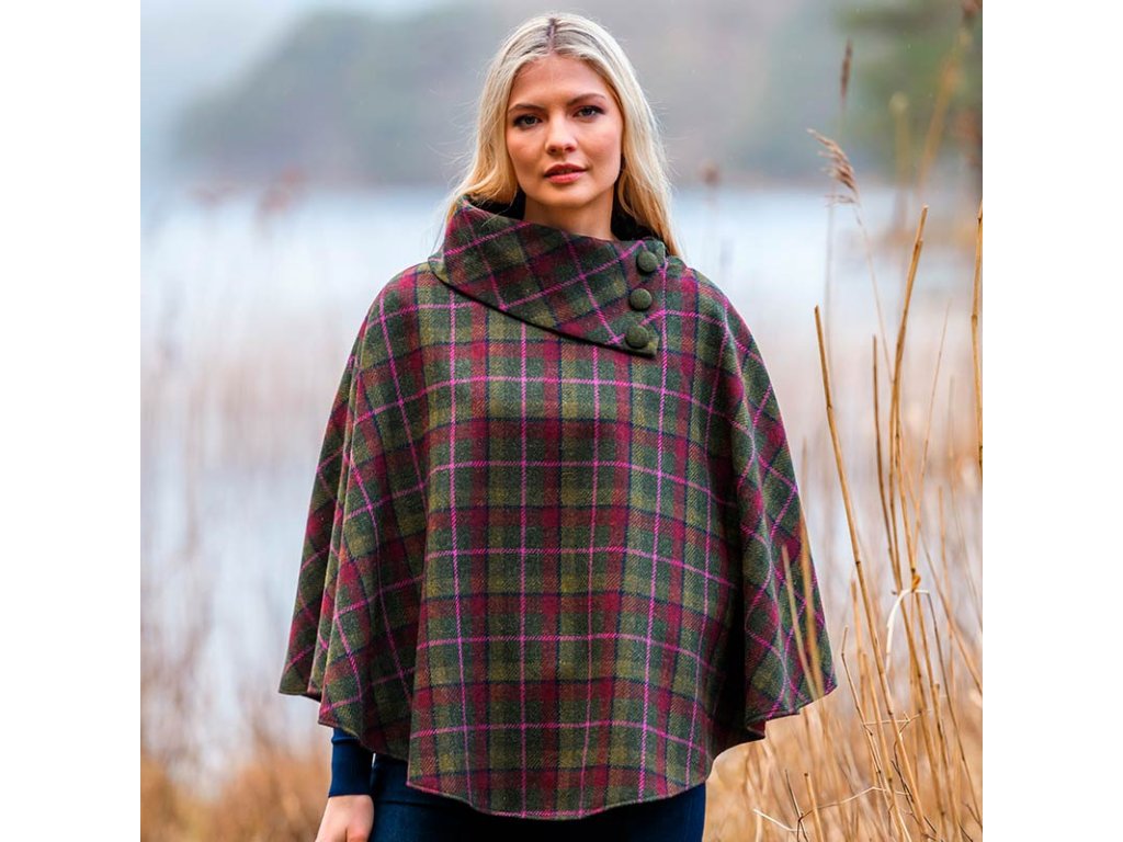 Woolen tkanina má pevnou strukturu a jemný povrch. Typický je široký límec s knoflíky a volný střih, který dopadne přirozeně kolem těla. Vzor i střih vycházejí z irského venkova a propojují řemeslo a jednoduchý, funkční tvar. Saténová podšívka zvyšuje pohodlí při nošení a umožňuje, aby pončo dobře sedělo na jakékoli postavě.