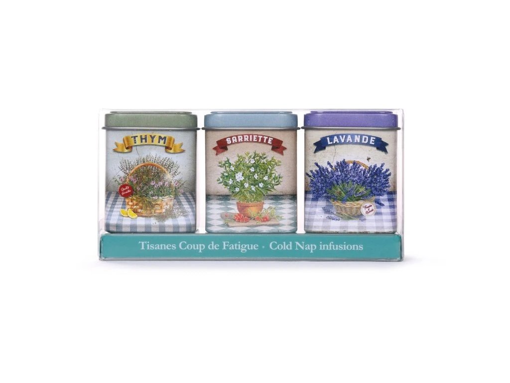 Trio bylinných čajů od Esprit Provence obsahuje tymián, saturejku a levanduli, bylinky známé svými tonickými a stimulačními účinky. Toto balení přináší čistou esenci Provence – každý čaj v této sadě nabízí výraznou chuť a bohatství esenciálních olejů, které potěší vaše chuťové buňky a posílí vaše tělo. Ideální volba pro chvíle relaxace i dodání energie. Baleno v praktické plechové dóze pro zachování čerstvosti a kvality bylin.