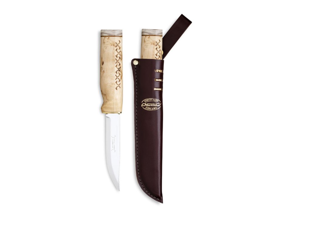 Univerzální finský nůž z produkce firmy Marttiini s rukojetí z břízy a parohu a koženou pochvou.