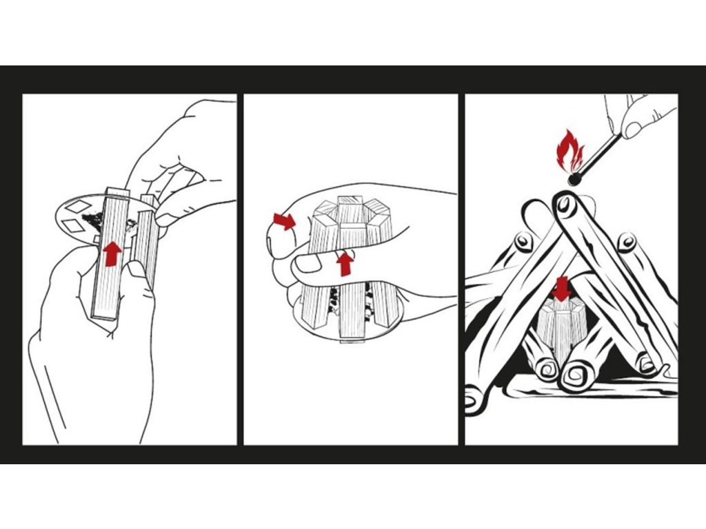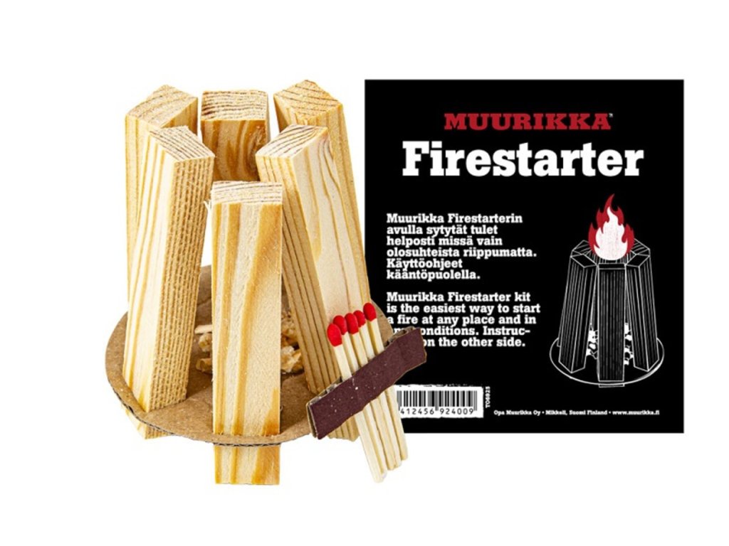 Muurikka Firestarter je zapalovací sada, která je pohodlně zabalena v malém, plochém balení a strčit do kapsy. Ekologický zapalovač, který nebyl vyroben z žádných škodlivých materiálů. Vyrobeno ze 100% recyklovaného kartonu a dřevěného odpadu. Kartonová deska má pět otvorů, do kterých jsou vztyčeny borovicové tyčinky. Na kartonové desce je přichycena podestýlka, která je zapálena přiloženými zápalkami.